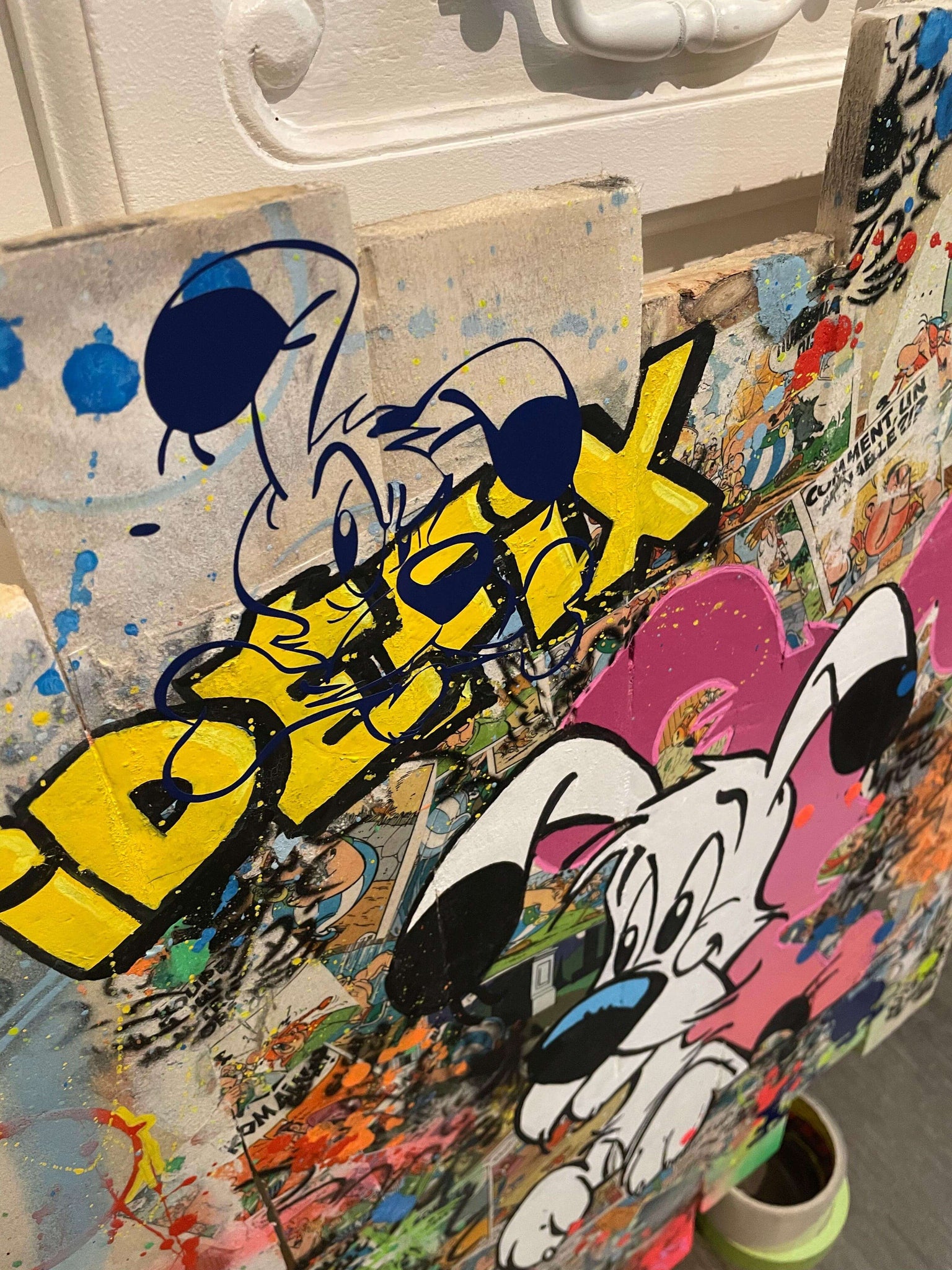 Ce tableau pop art unique met en scène Idéfix, le fidèle chien d’Obélix, sur une base en bois de palette. Il intègre des pages originales de bandes dessinées d’Astérix, des pochoirs délicats et des transferts colorés, combinant techniques d’acrylique et bombes de peinture pour un style urbain contemporain. Protégé par un vernis mat, il est signé et numéroté 1/1 par l’artiste français Vincent Streiff®.