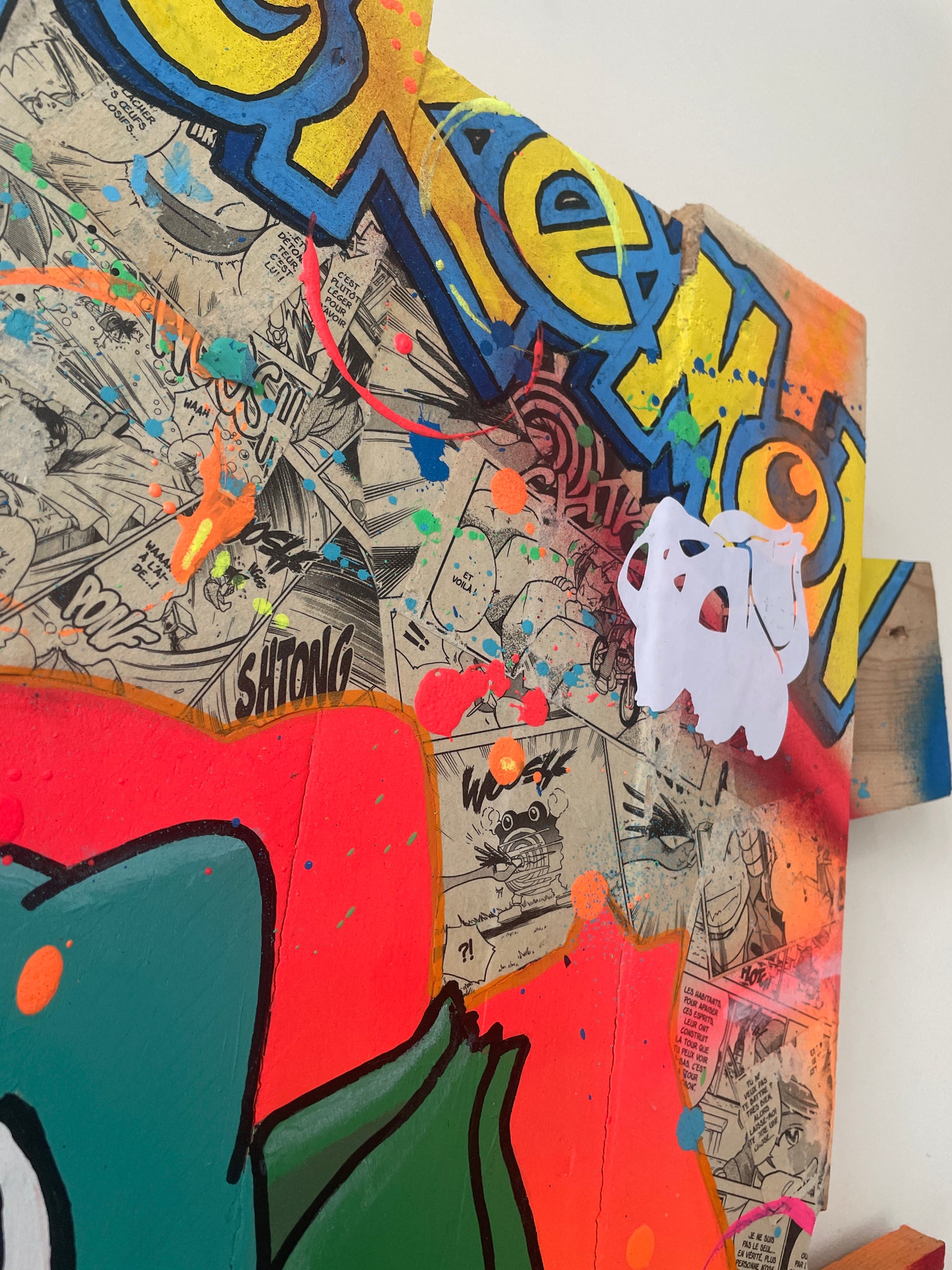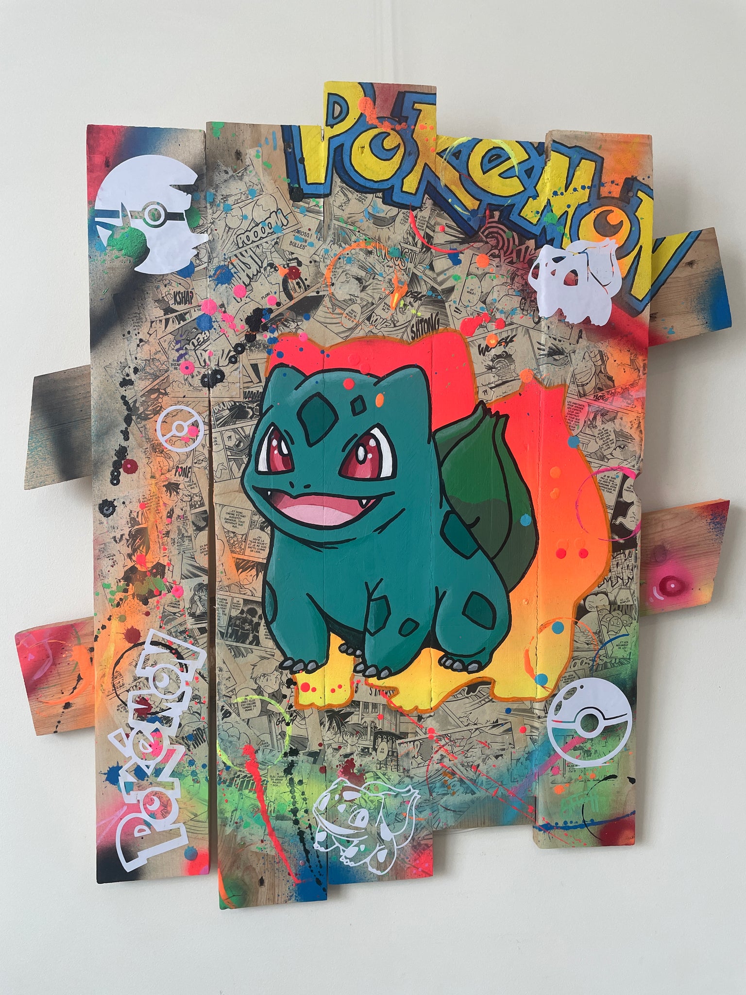 Inspiration et matériaux : Ce tableau, de style Pop art, avec le personnage Bulbizzare. Il intègre des éléments variés comme des extraits des Mangas, de la peinture acrylique, des marqueurs, et des bombes de peinture, le tout fini avec un vernis mat pour une protection optimale.