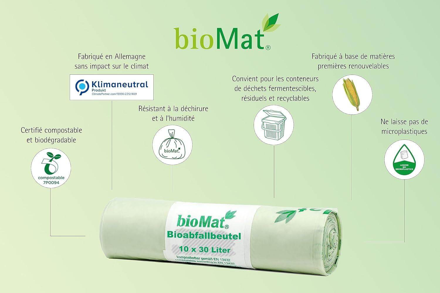CONTENU : 10 sacs poubelle biodégradables et compostables 30l, dimensions 530 x 600 mm, 10 unités par rouleau. QUALITÉ PREMIUM : En tant que leader du marché avec plus de 25 ans d'expérience, nous attachons une grande importance à la qualité de nos produits. Nos sacs poubelle 30l haut de gamme sont fabriqués à partir de matières premières renouvelables et garantissent une élimination fiable de vos déchets organiques. Nous appliquons des contrôles de qualité stricts afin de garantir que chaque sac compostable répond à nos normes élevées et respecte l'environnement.