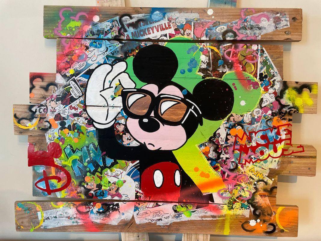 Ce tableau unique de Mickey Lunettes de soleil est conçu avec passion et minutie à partir d'une base sur mesure en bois de palette. Inspirée du style POP Art, cette création représente Mickey avec élégance.