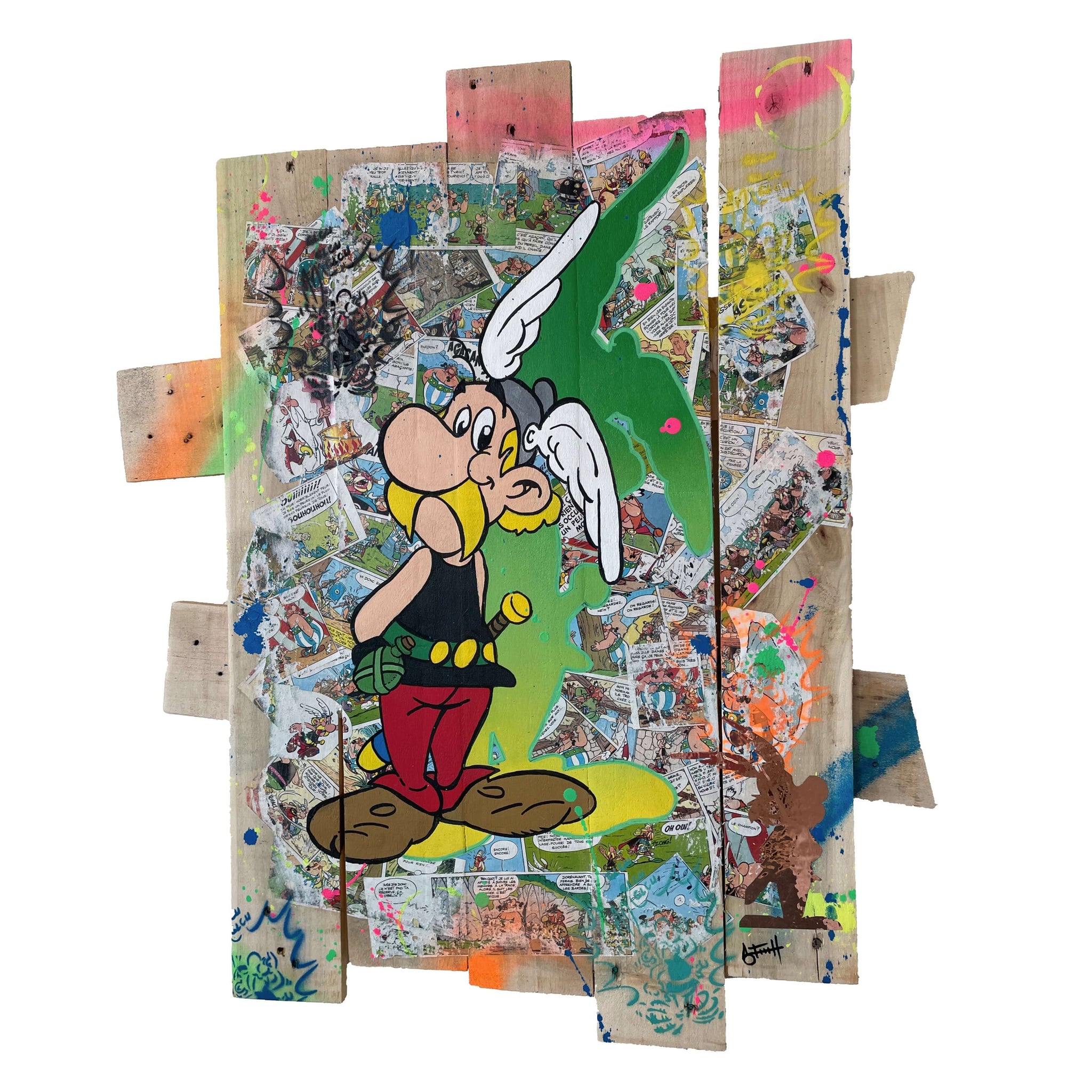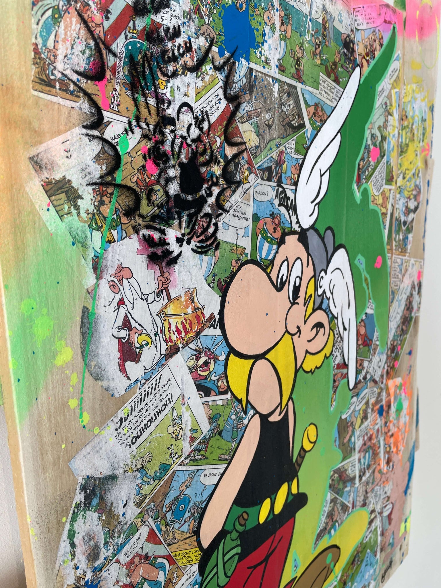 Des extraits de la bande dessinée "Astérix et Obélix" sont collés sur le support, formant un collage qui évoque les aventures célèbres du duo gaulois. Ces références visuelles rappellent également les adaptations en dessin animé, créant un lien entre les différentes incarnations des personnages.