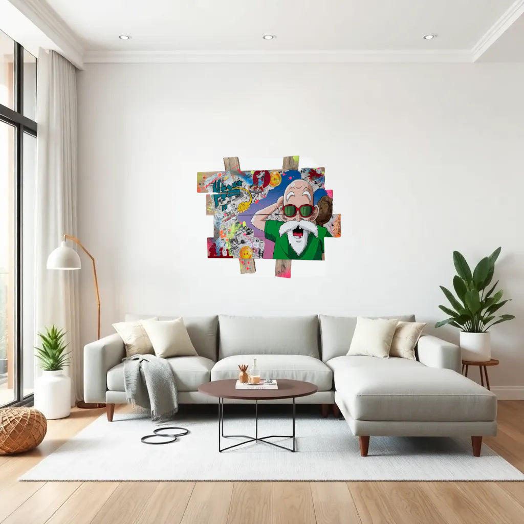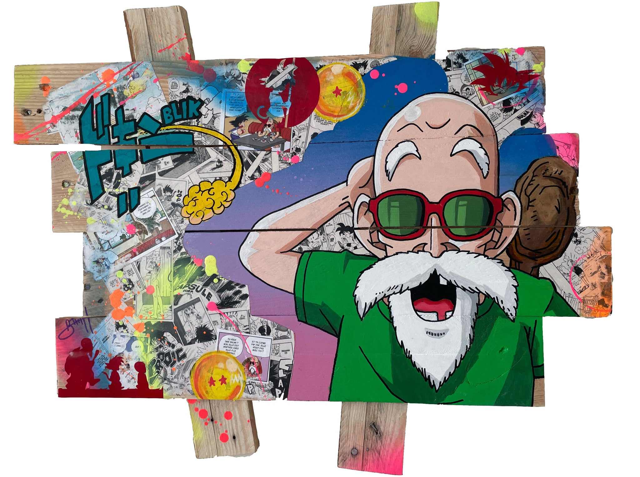 Fabriqué par l’artiste sur un support issu de bois de palette recyclé, ce tableau est une œuvre vibrante qui rend hommage à Tortue Géniale, le maître emblématique de la saga Dragon Ball. Avec une exécution soignée, chaque détail est pensé pour capturer l'esprit espiègle et sage du personnage.