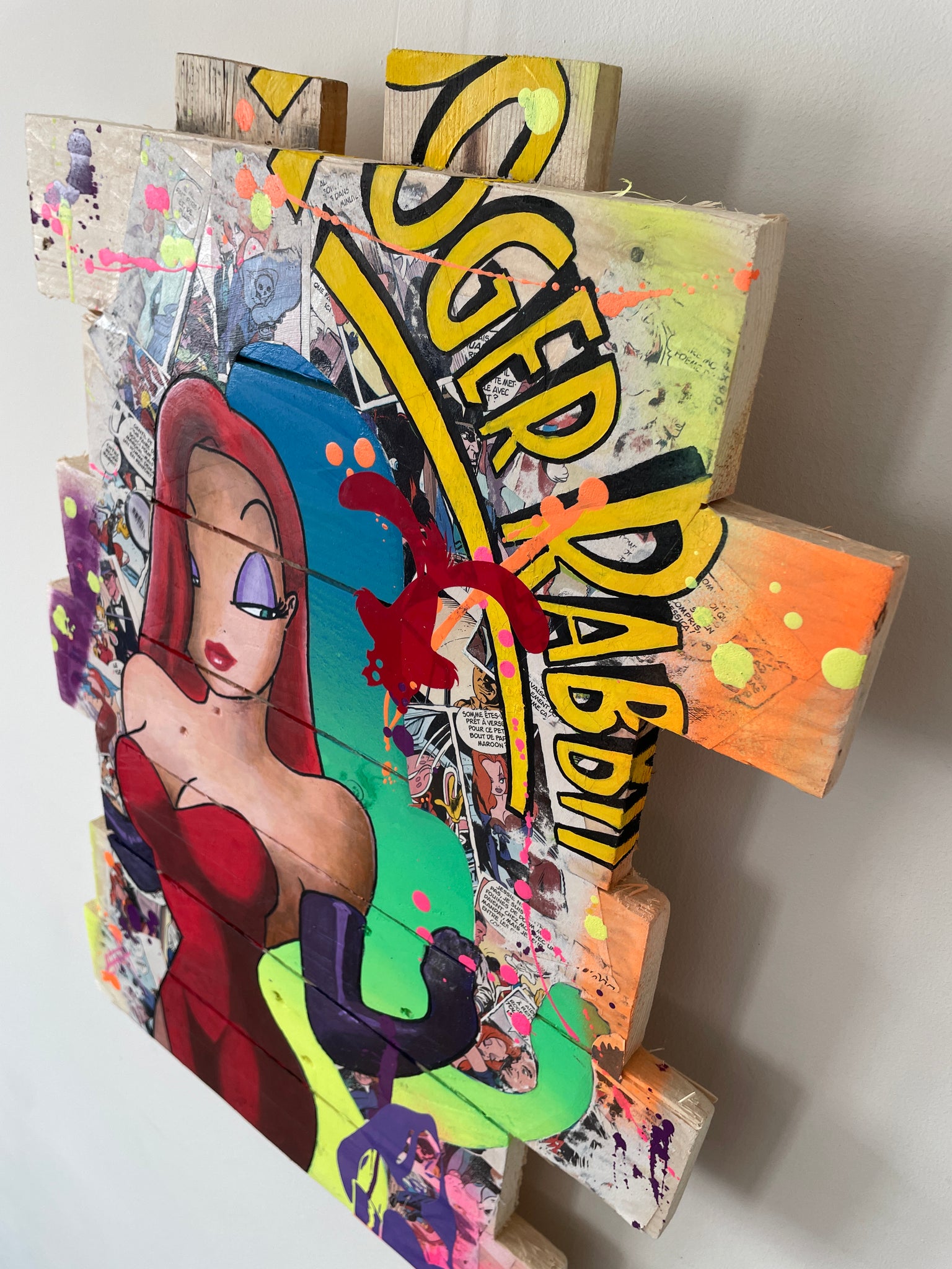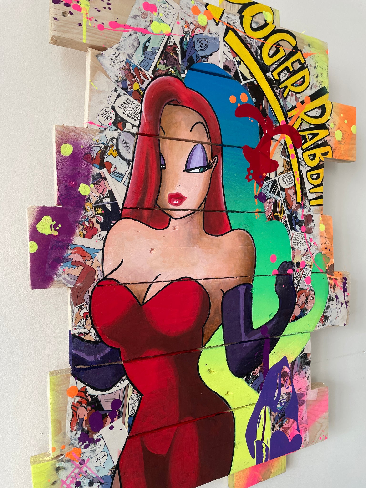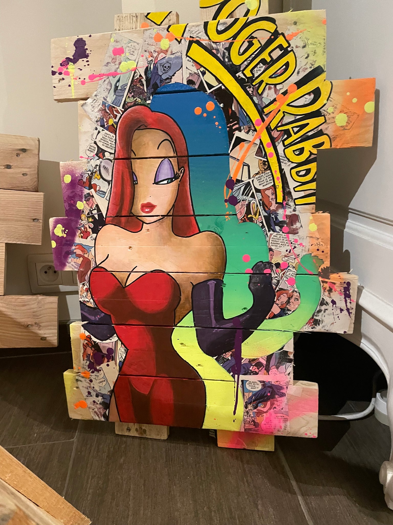 Fabriqué sur un support en bois de palette recyclé, cette œuvre est une création captivante qui rend hommage à Jessica Rabbit, l'icône charmante et charismatique de l'univers de Roger Rabbit. Chaque détail est soigneusement conçu pour refléter la beauté et le mystère du personnage.