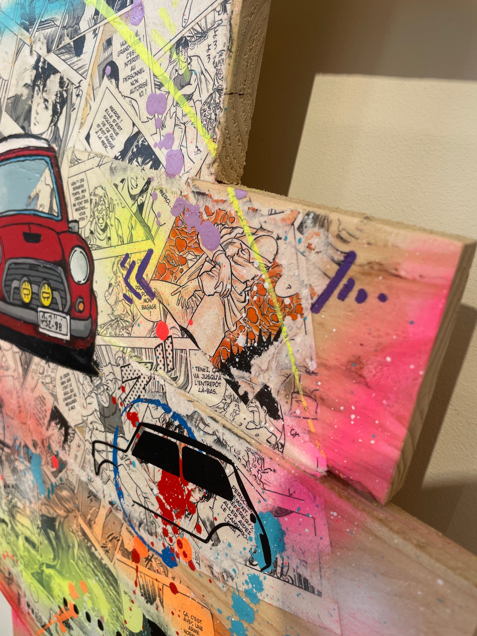Les extraits de bande dessinée intégrés au tableau évoquent directement l'univers de Nicky Larson, rappelant sa discographie et son style caractéristique. Ces éléments graphiques fragmentés permettent de recréer l'atmosphère dynamique et humoristique du personnage.