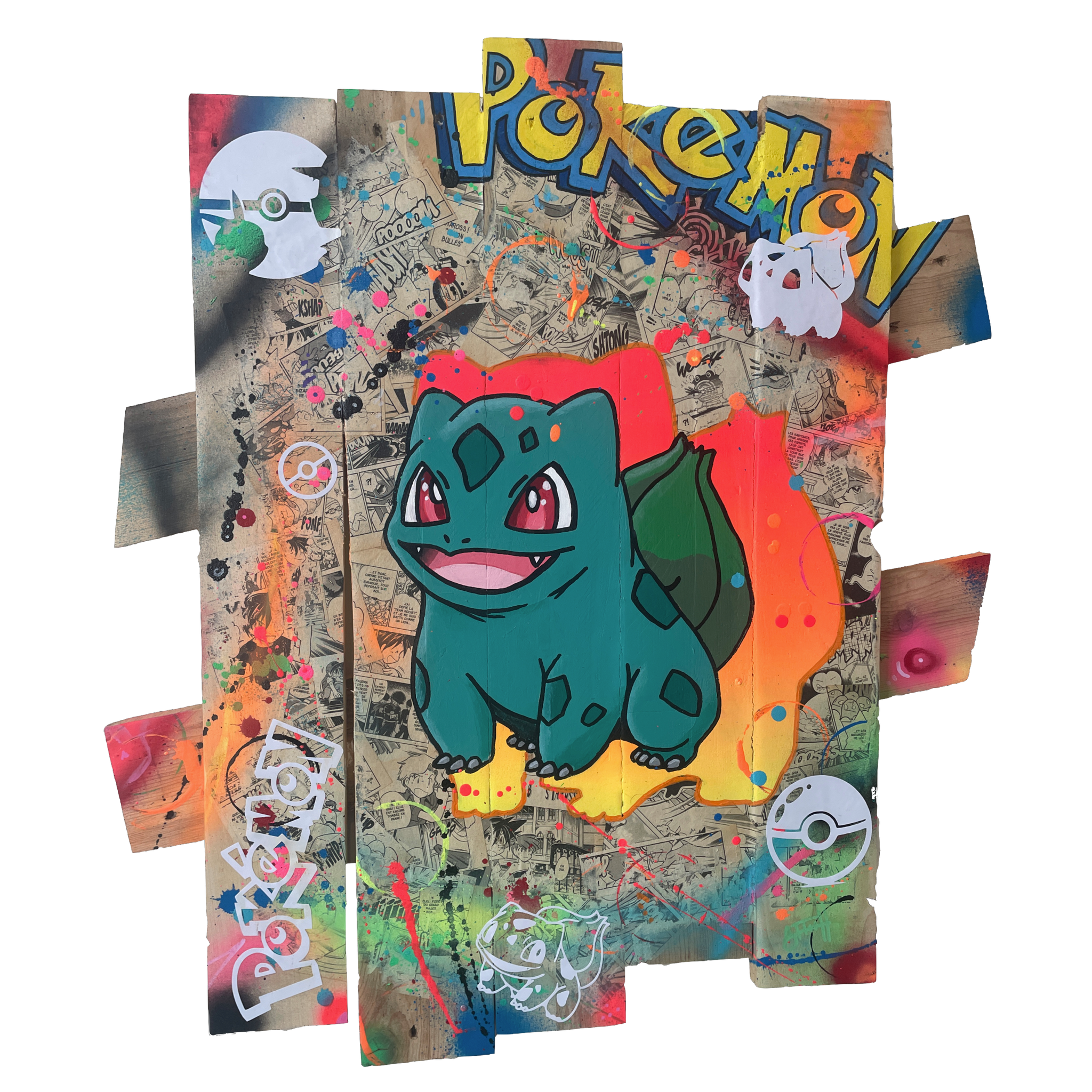Inspiration et matériaux : Ce tableau, de style Pop art, avec le personnage Bulbizzare. Il intègre des éléments variés comme des extraits des Mangas, de la peinture acrylique, des marqueurs, et des bombes de peinture, le tout fini avec un vernis mat pour une protection optimale.