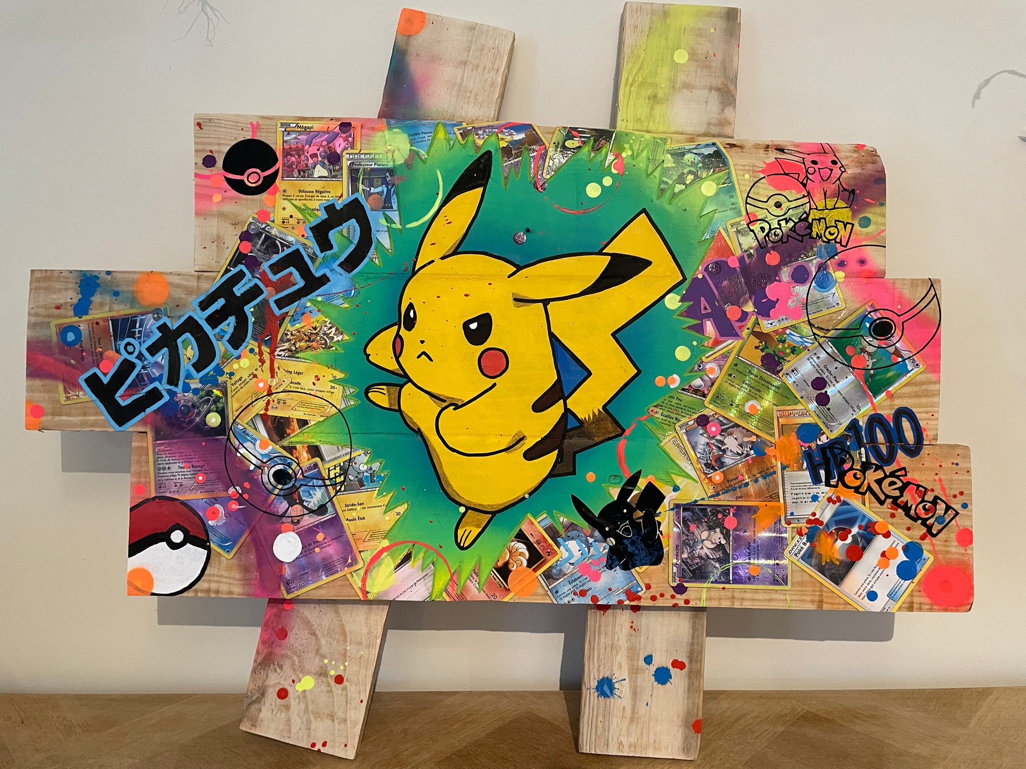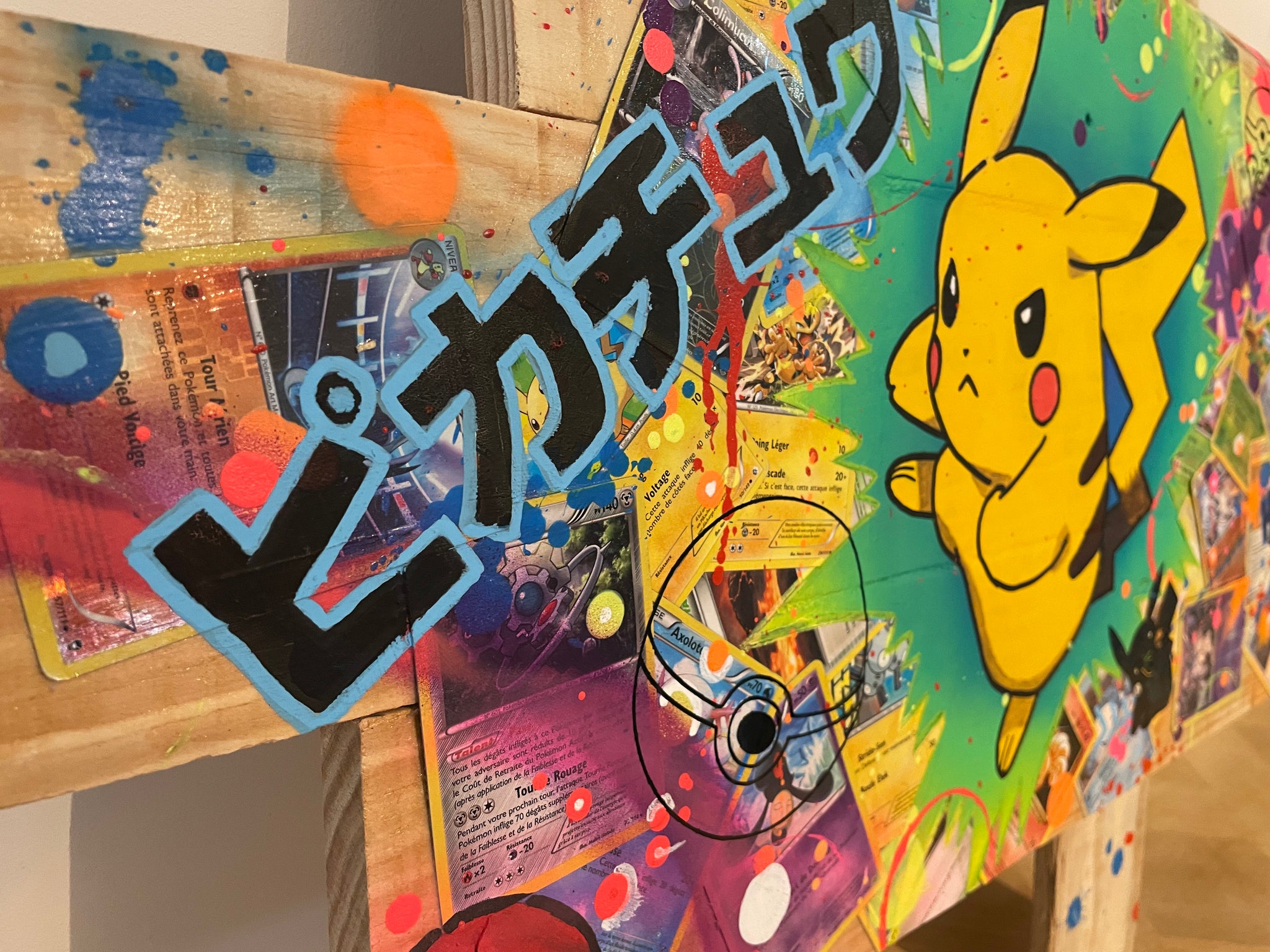 Les matériaux utilisés pour sa création sont des originaux de cartes POKEMON, de la peinture et des feutres acryliques, ainsi que des bombes de peinture, avec une finition à base de vernis mat pour une protection optimale.