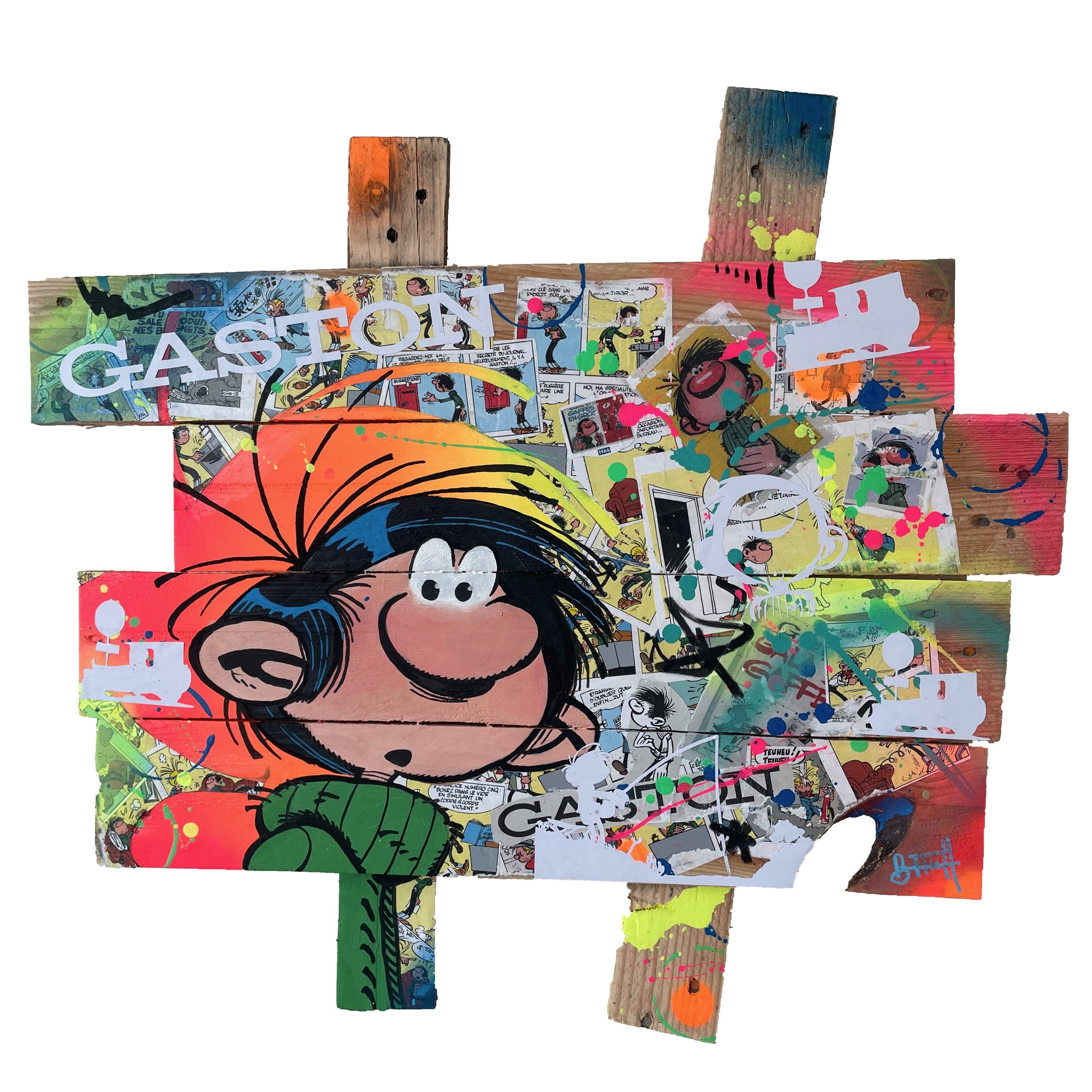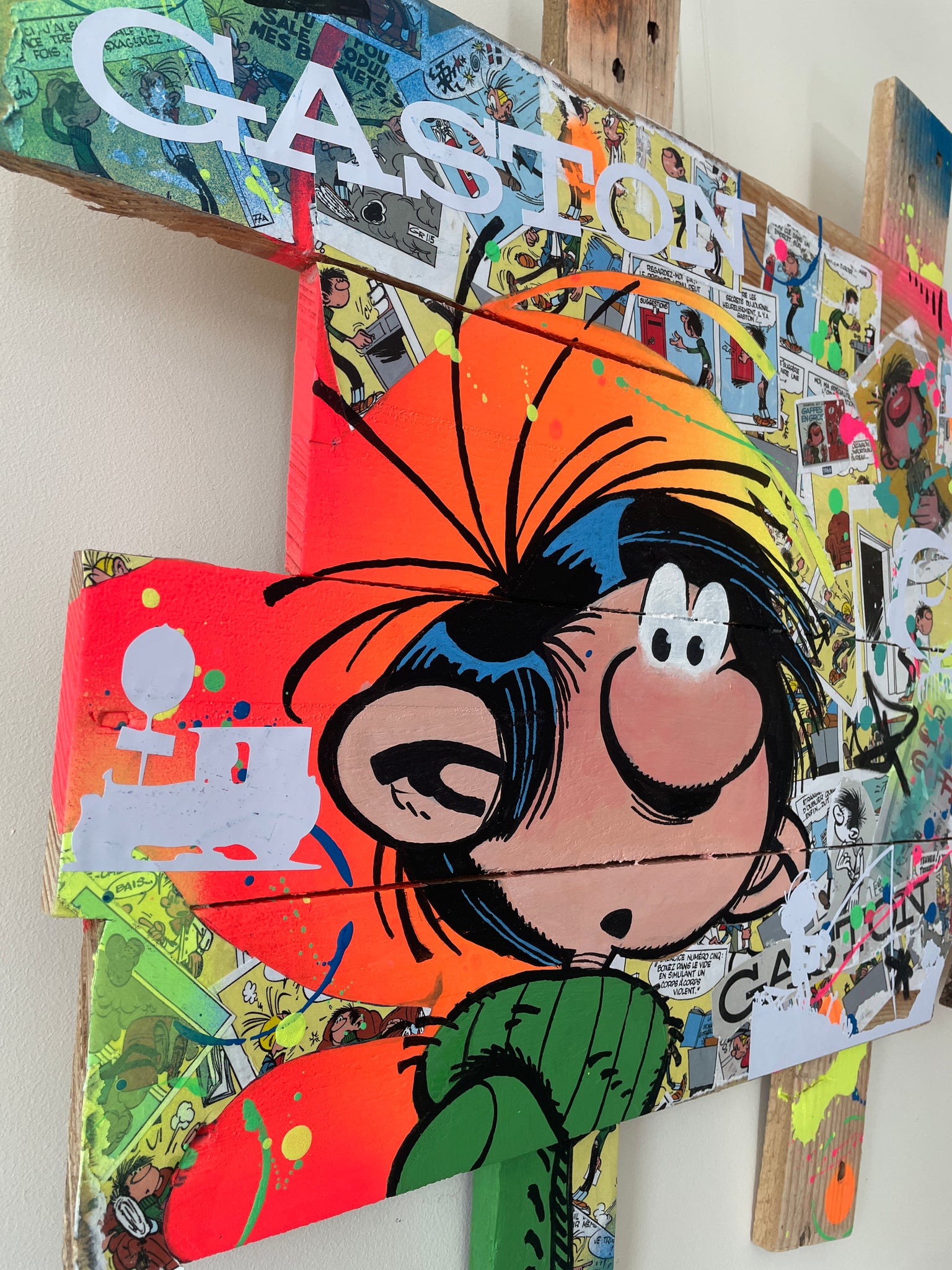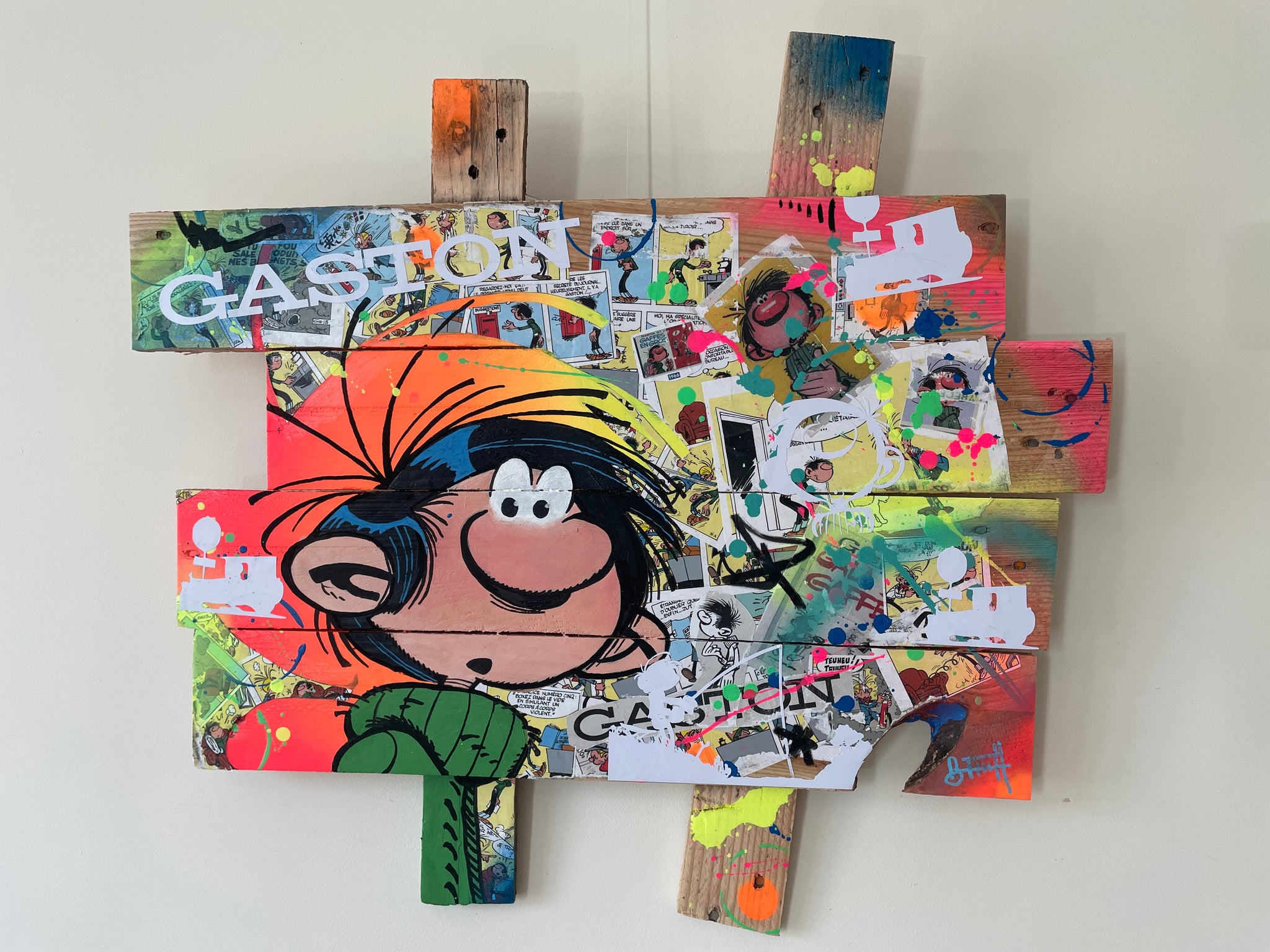Construit à partir d'humbles planches de palette, ce tableau est une mosaïque de vie. La peinture acrylique, vibrante et expressive, donne vie aux personnages et aux situations emblématiques de Gaston. Les bombes de peinture, sauvages et spontanées, capturent l'énergie débordante du personnage.